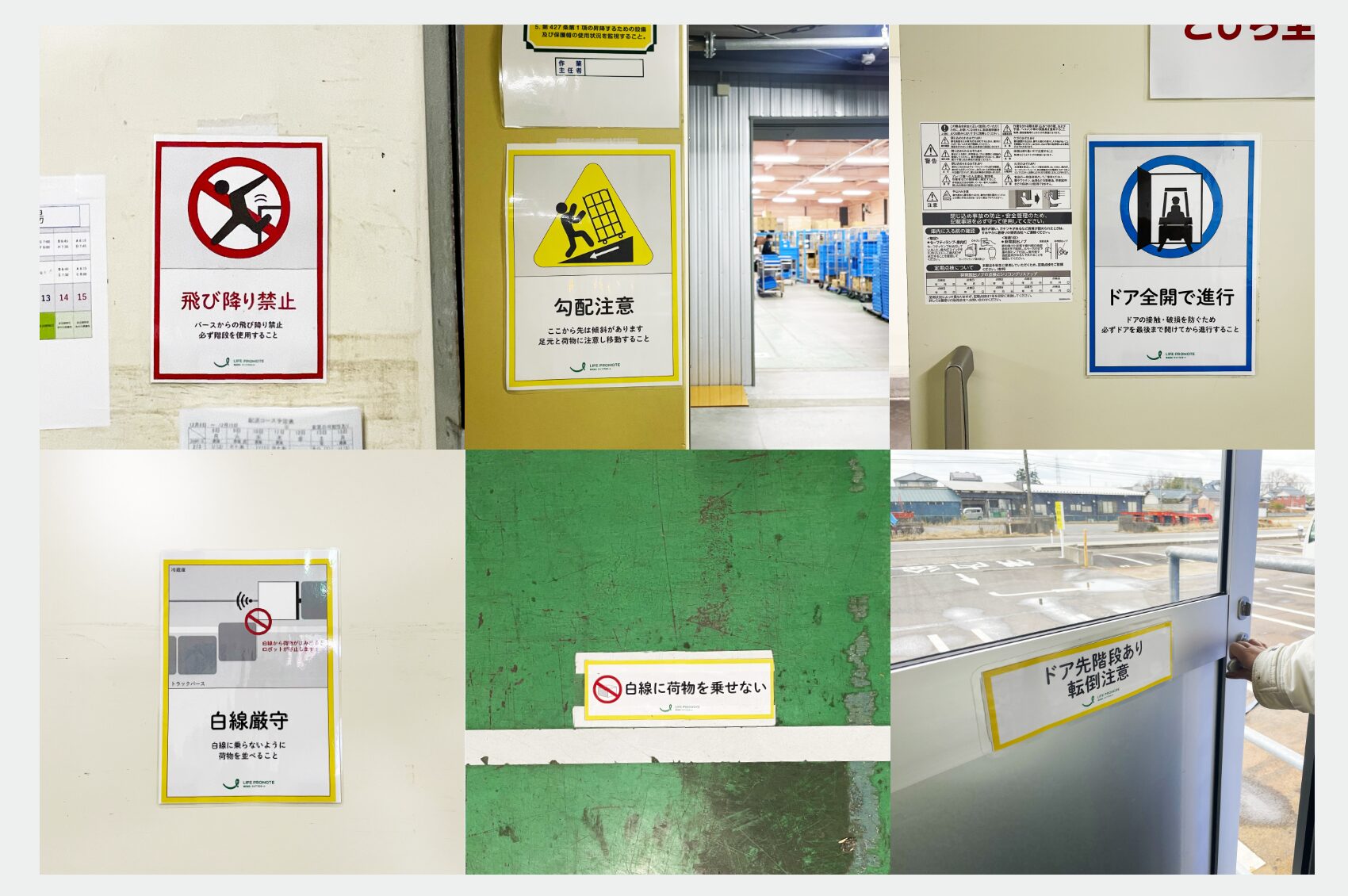 「トラックはどこから進入し、どこで待機するのか?」「フォークリフトと歩行者の交差ポイントはどこか?」など、詳細なヒアリングに基づき、案内・安全の両面から必要なサイン計画を策定。CAPESでは主に、現場の安全を守るためのオリジナルサイン制作を担いました。