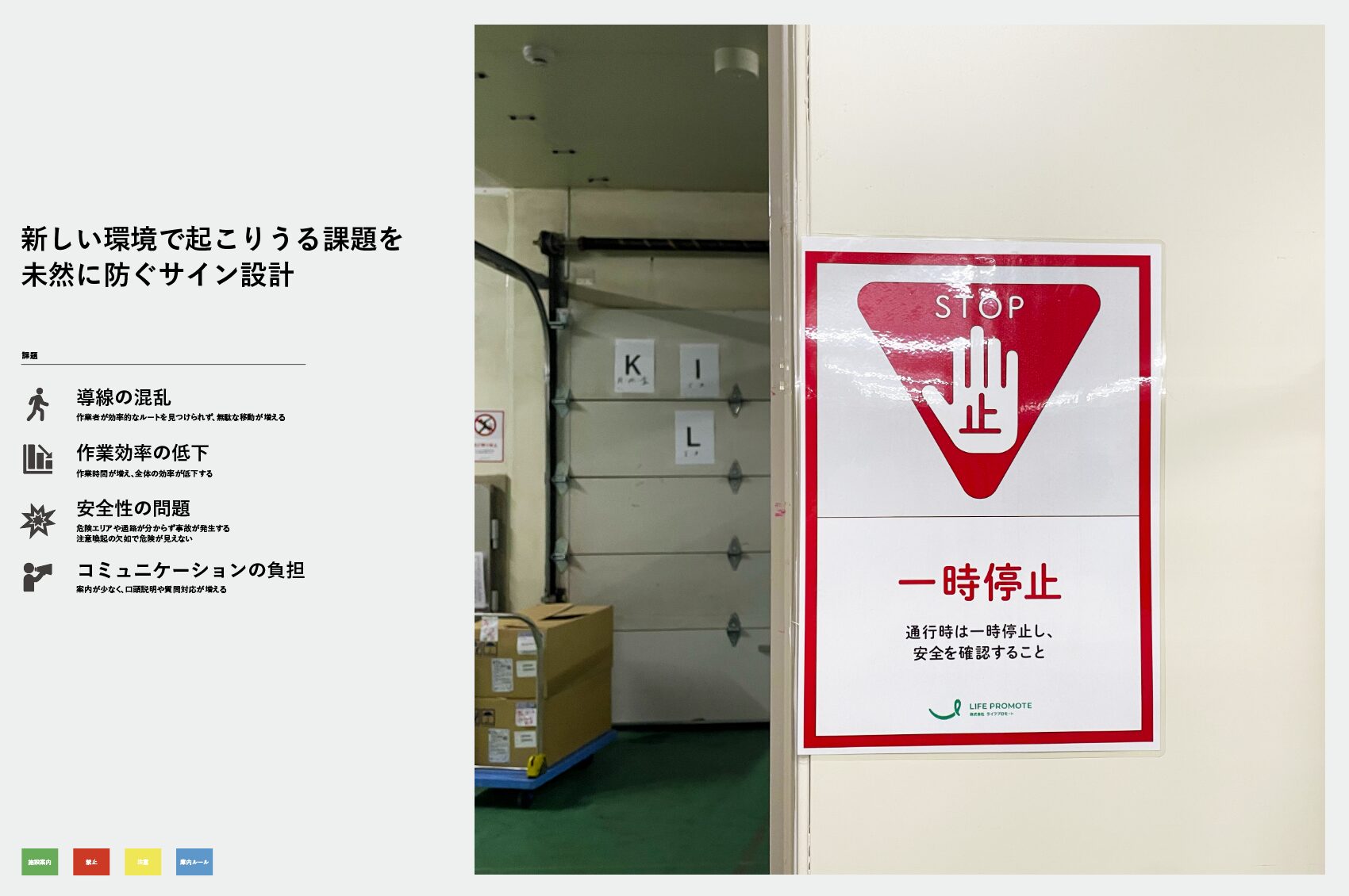 導入されたAGVと「人」が安全に共存するための、物理的な注意喚起サインをデザイン・配置 - 現場実習を経たサイン制作