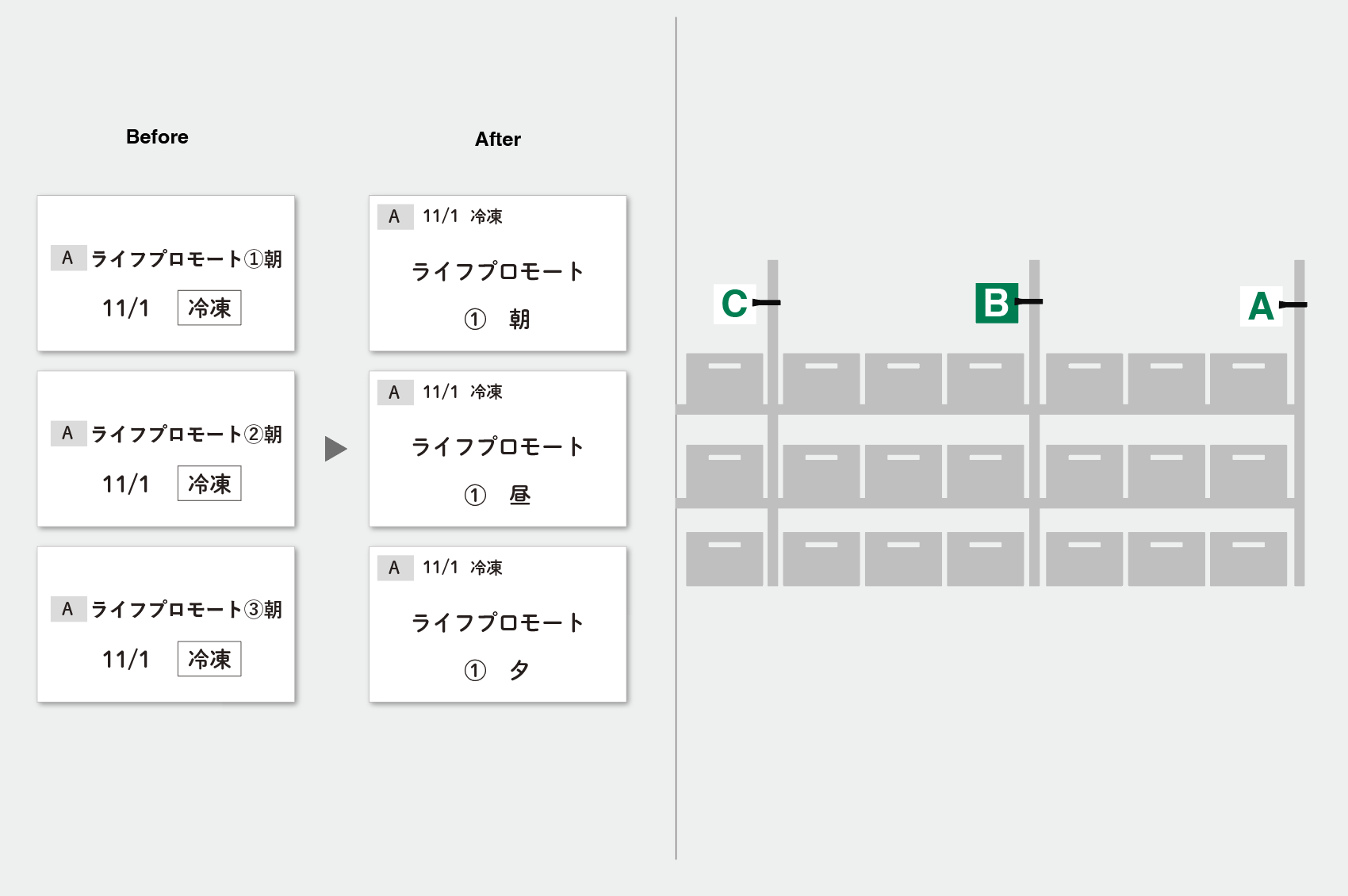 スタッフが情報を読み取る順番を分析し、再配送リスクに直結する項目を強調。既存のシステムに負荷をかけない範囲で、直感的に判別できるデザインへ再設計しました。 - 柔軟な動線に対応する「可動式サイン」の導入
